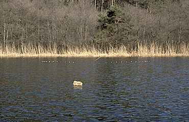 Bildmitte ist vom Ufer aus das Leitnetz zu erkennen. Die kleinen Schwimmer