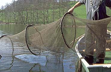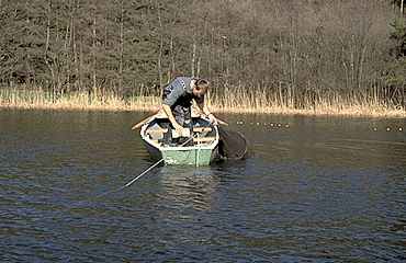 halten die Flügel des Trappnetzes. Der große Schwimmer im Vordergrund
